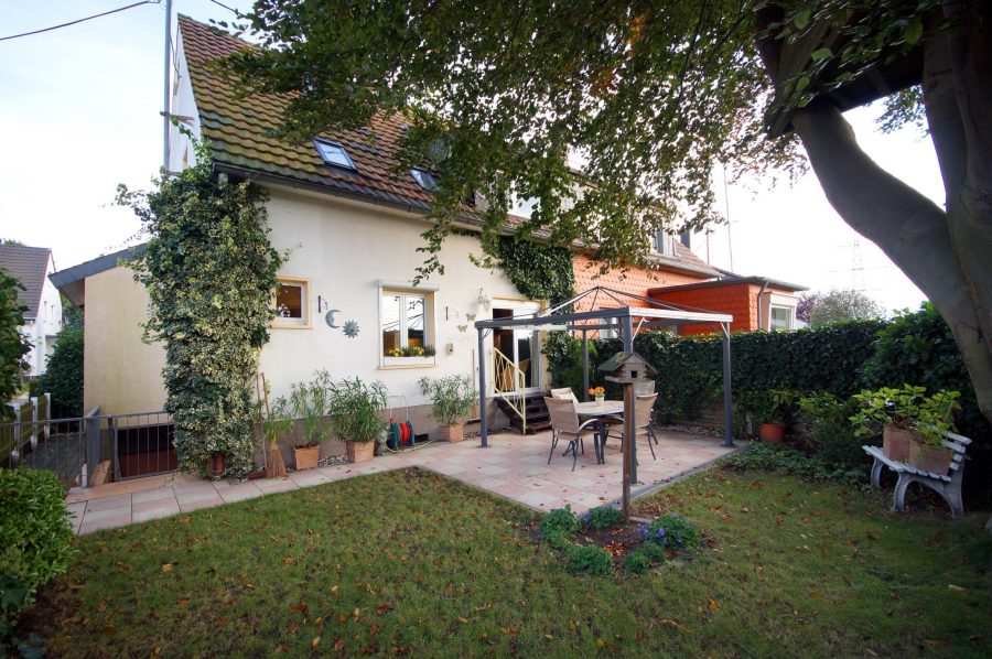 Über die Kelleraußentreppe oder über die große Türe in der Wohnküche gelangt man in den Garten mit Terrasse in Westausrichtung. Der Garten mündet direkt an einen Feldweg mit freiem Blick in Richtung Frechen-Königsdorf. Vor dem Haus gibt es ebenfalls ein Garten. Weiterhin sind dort 2 gepflasterte PKW-Stellplätze vorhanden.