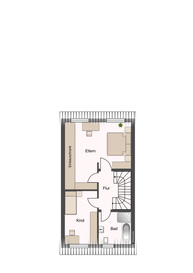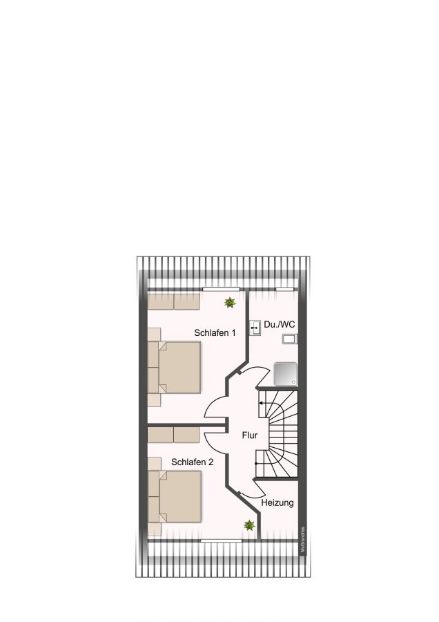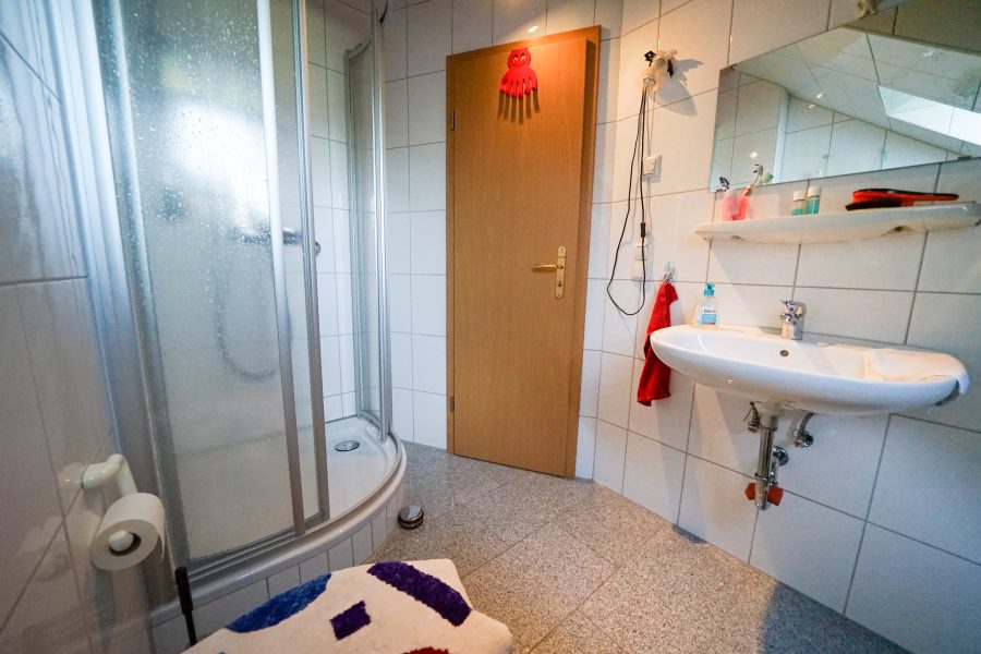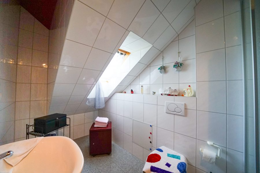 Das Dachgeschoss ist bis in die Dachspitze ausgebaut und bietet Ihnen daher maximale Raumgrößen & Deckenhöhen. Hier oben finden Sie 2 weitere Schlafzimmer (ca. 13 & 11 m²) sowie ein Tageslichtbad mit Dusche, WC & Waschbecken. Auch die sparsame & erst 2018 erneuerte Gas-Brennwert-Therme mit Warmwasser befindet sich platzsparend unter dem Dach.