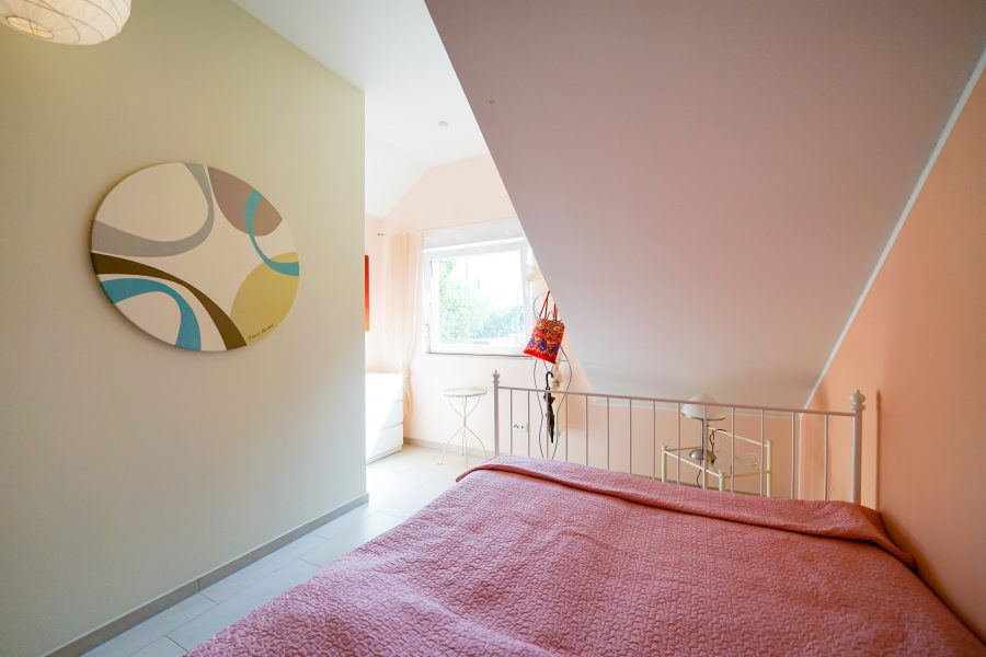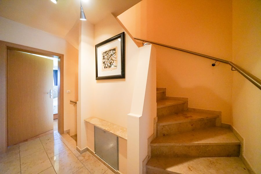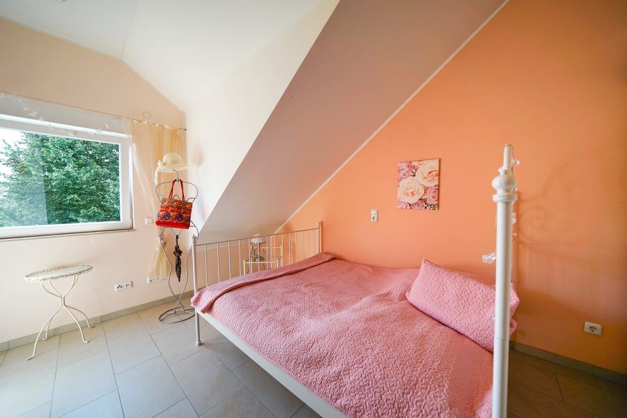 Die massive Beton-Treppe führt Sie in das großzügig dimensionierte Obergeschoss. Dort erwartet Sie das große Elternschlafzimmer, das ursprünglich aus 2 separaten Zimmern bestand. Durch das Entfernen der Zwischenwand ist ein etwa 25 m² großer Raum entstanden, der Platz für ein King-Size-Bett und einen XL-Kleiderschrank bietet. Wer die ursprüngliche Aufteilung wiederherstellen möchte, kann mit dem Einziehen einer Trockenwand schnell und kostengünstig ein zusätzliches Zimmer schaffen. Somit würde das Haus insgesamt über 6 Zimmer verfügen. Im OG befindet sich ein weiteres, ca. 12 m² großes Zimmer sowie ein Tageslichtbad mit Dusche & Wanne.