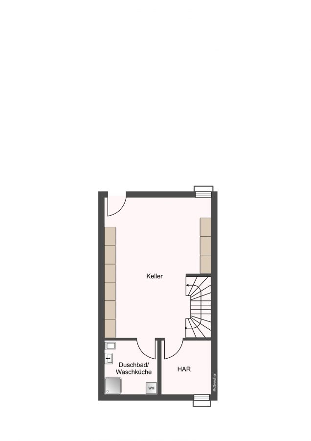 Das Haus verfügt über ein vollständig unterkellertes und bis auf den Hausanschlussraum auch wohnlich nutzbares Untergeschoss. Dort befindet sich neben einem ca. 34 m² großen Raum ein ca. 8 m² großes Duschbad mit integrierter Waschküche. Ein Jugendzimmer oder Büro wäre hier denkbar. Um die Terrassenfläche im EG zu vergrößern, wurde die Kelleraußentreppe überbaut, was den Zugang zum Garten nicht ermöglicht. Dieser Bereich bietet nun zusätzlichen Stauraum.