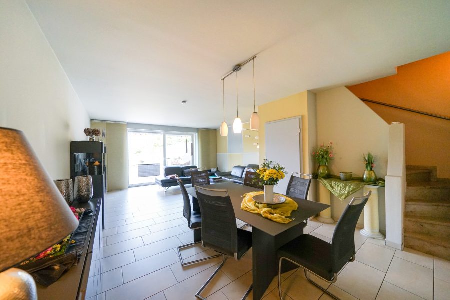 Über die in anthrazit gehaltene Sicherheits-Eingangstür mit Glaseinsatz gelangen Sie in den Eingangsbereich mit Diele, Gäste-WC und Garderobe. Die Böden im Erdgeschoss sind mit eleganten und zeitlosen, hellen Feinsteinfliesen im Großformat belegt. Die Fußbodenheizung garantiert eine behagliche Wärme. Der ca. 35 m² große und helle Wohn- & Essbereich lädt zum Verweilen ein und führt über eine große Schiebetür auf die ca. 20 m² Terrasse mit anschließendem Garten. Der Außenbereich ist grün und ruhig. Hier finden Hobbygärtner und Grillenthusiasten ideale Bedingungen, um ihren Aktivitäten nachzugehen. Zurück im Haus gelangen Sie durch einen hübschen Rundbogen in die ca. 10 m² große Küche. Die maßgefertigte Einbauküche verfügt über sämtliche erforderlichen Geräte und bietet eine gemütliche Frühstückstheke, die den perfekten Rahmen für eine entspannte Morgenroutine schafft.