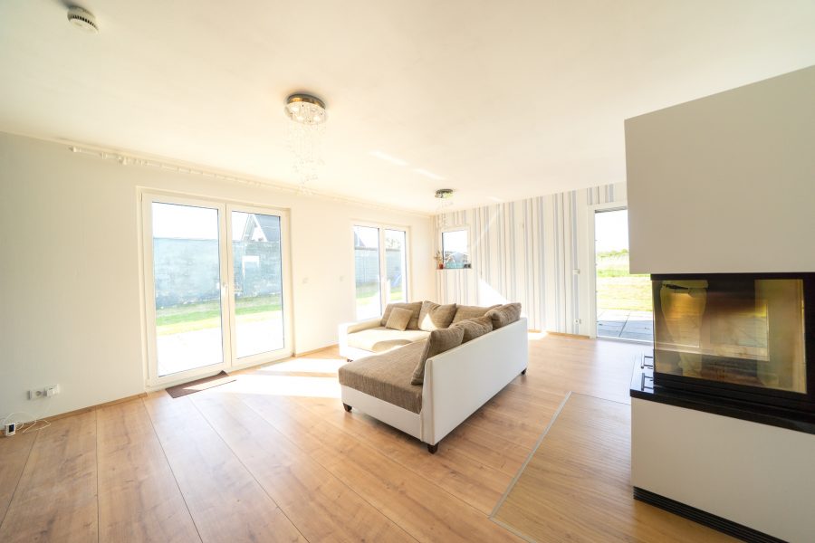 Bereits beim Betreten des Haupthauses über den seitlichen Eingang wird die durchdachte Raumaufteilung und das helle, freundliche Wohnambiente spürbar. Das Herzstück der Immobilie bildet der großzügige Wohn- und Essbereich mit großen Fensterflächen, die für einen optimalen Lichteinfall sorgen und direkten Zugang zur 120 m² Terrasse und dem weitläufigen Garten bieten. Ein moderner Wohnkamin schafft hier eine besonders behagliche Atmosphäre. Die offen gestaltete, neuwertige Küche fügt sich harmonisch in den Wohnbereich ein. Ergänzt wird das Erdgeschoss durch ein geräumiges Gäste-WC mit Dusche und Tageslicht.