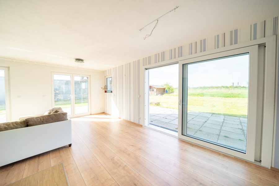 - großzügiger Wohn- und Essbereich mit Wohnkamin und Gartenzugang