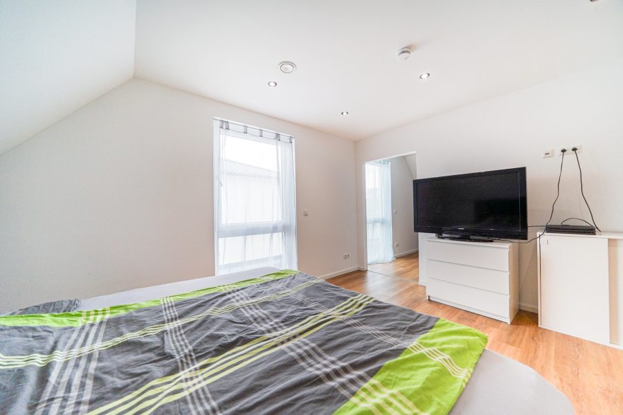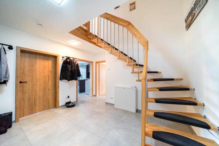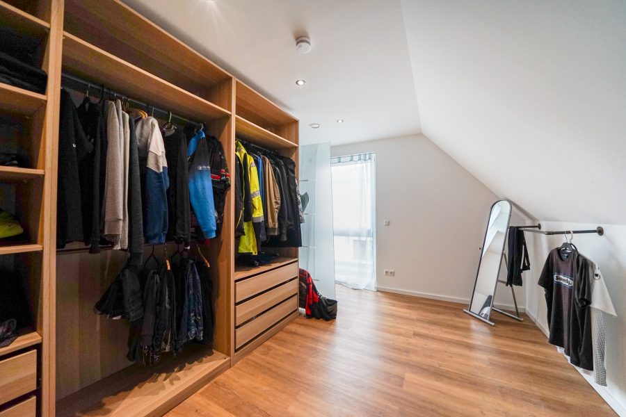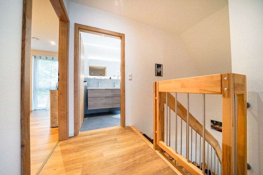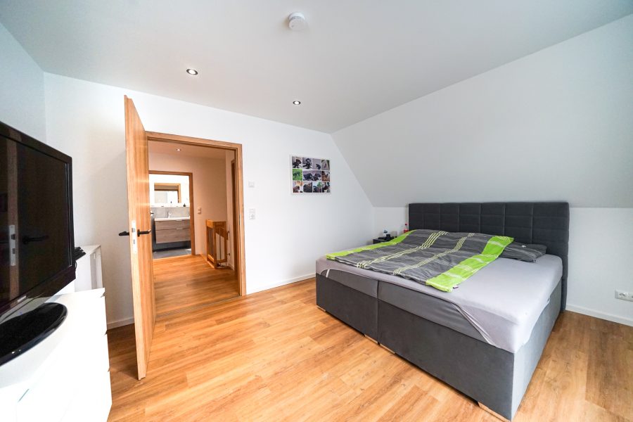 Zurück im Haus gelangen Sie über die schöne, offene Buchenholztreppe in das ausgebaute Dachgeschoss. Hier finden Sie ein großzügiges Elternschlafzimmer mit angrenzendem Ankleideraum, ein Kinderzimmer, ein Abstellraum und das Masterbad mit XL-Dusche und Badewanne. Das Ankleidezimmer kann optional als weiteres Schlafzimmer genutzt werden.