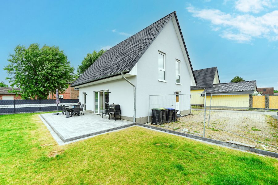 Die Außenanlagen vor und links neben dem Haus sind noch nicht fertiggestellt. Links vom Haus war ursprünglich ein großer Carport geplant. Aller Voraussicht nach lässt sich hier, nach Abstimmung des neuen Eigentümers mit dem Bauamt, auch eine Garage errichten.
