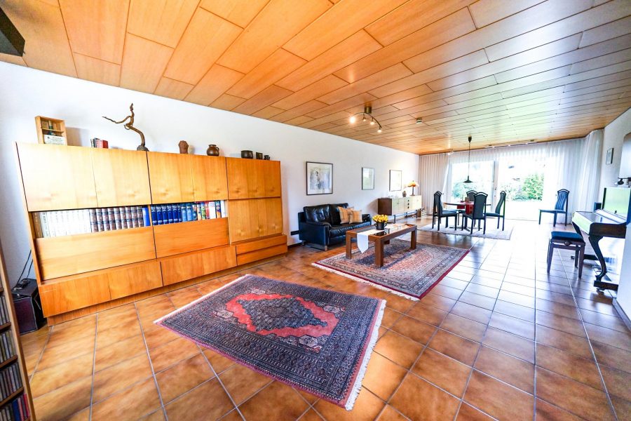 Zur Straßenseite ist der Raum mit 2 großen Fenstern ausgestattet, welche den Raum mit Tageslicht erhellen. Zur Gartenseite hat der Raum eine große Glasschiebetür, die zur Terrasse führt. Sie erreichen die Küche sowohl vom Wohn- und Essbereich als auch von der Diele. Von dort betreten Sie direkt die große und überdachte Terrasse. Auch von hier aus finden Sie einen Zugang zum liebevoll angelegten Ziergarten, wo Sie die Sonne genießen können. Ein Traum für Freunde, Familie und Kinder!