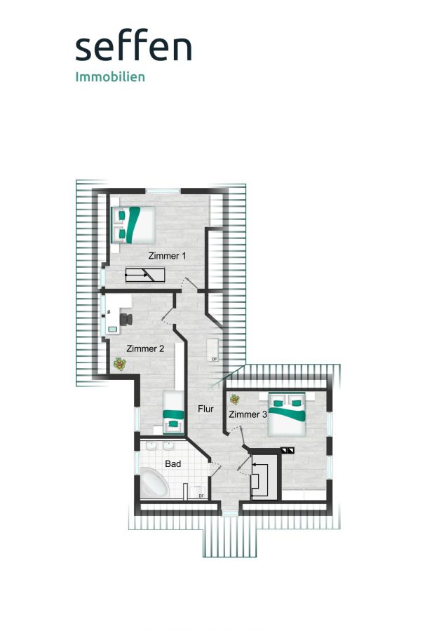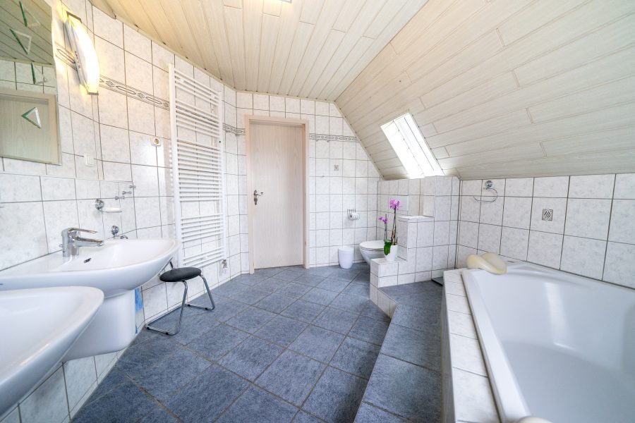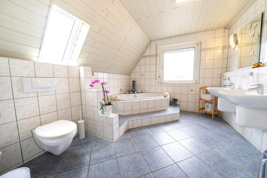 Im Obergeschoss befinden sich drei Schlafzimmer, von denen zwei über praktische Nischen für Schränke oder Schreibtische verfügen. Das große Zimmer mit Rundfenster bietet einen schönen Blick in den Garten. Das geräumige Wannenbad mit Eckbadewanne stammt aus dem Jahr 1994 und bietet Platz für die ganze Familie.