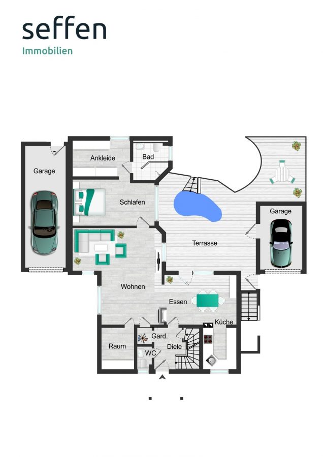 Das Angebot wird durch 2 Garagen mit viel Platz abgerundet. Die Garagen befinden sich jeweils links und rechts neben dem Haus.