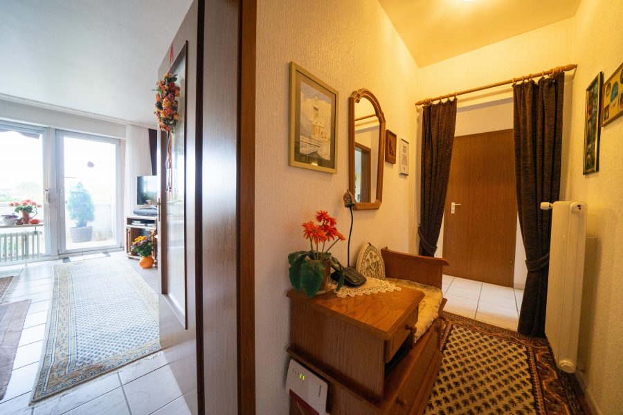 Im Obergeschoss befindet sich die zweite Wohnung mit rund 70 m² Wohnfläche. Sie verfügt über ein Schlafzimmer, ein Wohnzimmer mit gemütlichem Eckbalkon, eine separate Küche sowie ein Dusch- und Wannenbad. Diese Einheit ist aktuell an ein älteres Ehepaar vermietet und erzielt eine Jahresnettomiete von 7.200 Euro. 2023 wurden im Obergeschoss die Gauben neu eingedeckt, diese sorgen für mehr Licht, ein größeres Raumgefühl und mehr Wohnkomfort. Auf derselben Etage liegt außerdem ein weiteres Zimmer mit Wasseranschlüssen, das zur Erdgeschosswohnung gehört - ideal als Gästezimmer oder Büro.