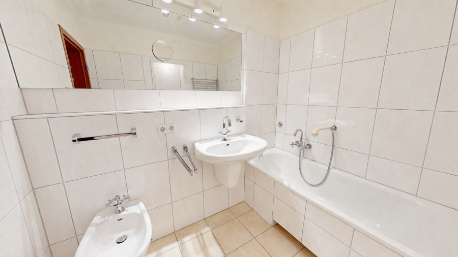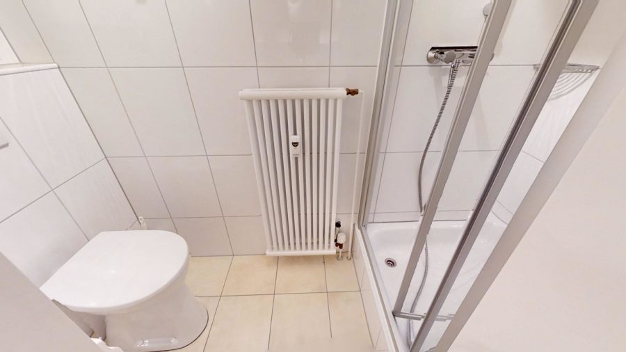 Das modern gestaltete Badezimmer überzeugt mit einer Badewanne sowie einer komfortablen Dusche. Badewanne und Dusche mit WC sind innerhalb des Badezimmers praktischerweise räumlich voneinander getrennt.