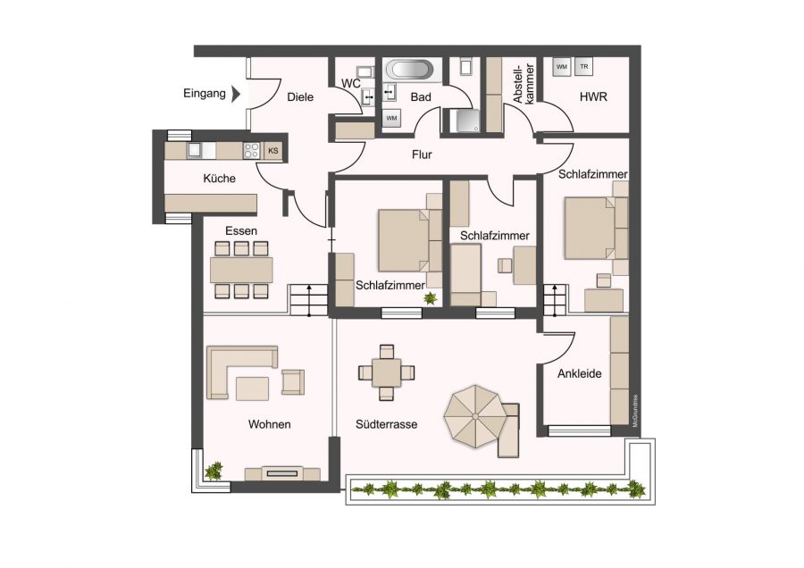 Ein praktischer Abstellraum nebst Hauswirtschaftsraum innerhalb der Wohnung sowie ein weiterer Abstellraum außerhalb der Wohnung bieten zusätzlichen Stauraum.