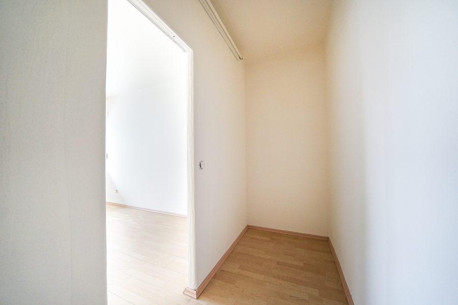 Vom Wohnzimmer aus gelangen Sie in das Schlafzimmer, das durch einen kleinen Abstellraum ergänzt wird. Dieser Raum kann ideal als Ankleide genutzt werden und bietet praktischen Stauraum.