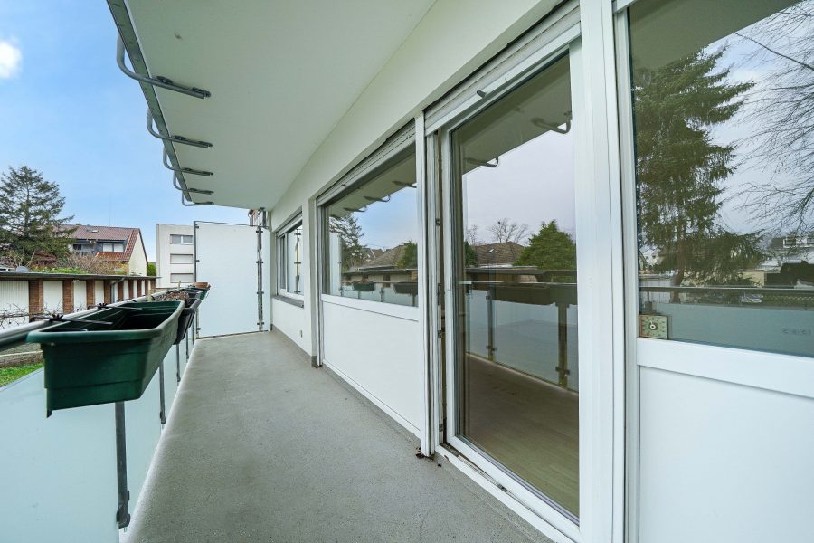 Auf der rechten Seite der Diele liegt das Wohnzimmer, das dank einer großen Fensterfront viel Tageslicht bietet. Von hier aus erreichen Sie einen weiteren Balkon. Vor zwei Jahren wurden die Balkone im ganzen Haus saniert und laden nun zum Entspannen ein.