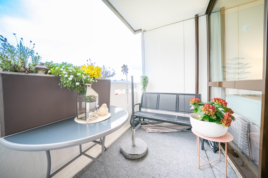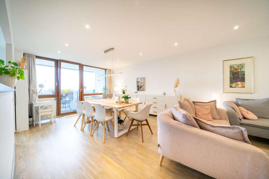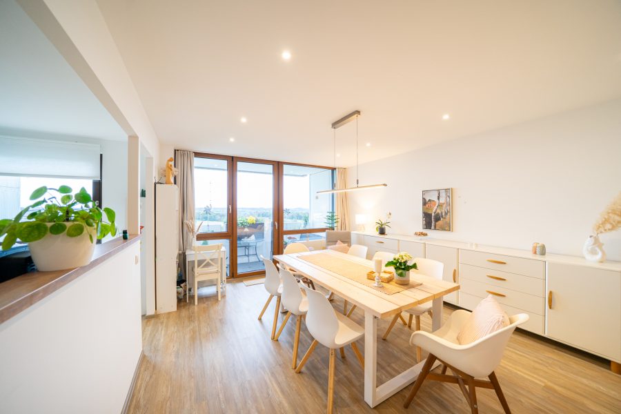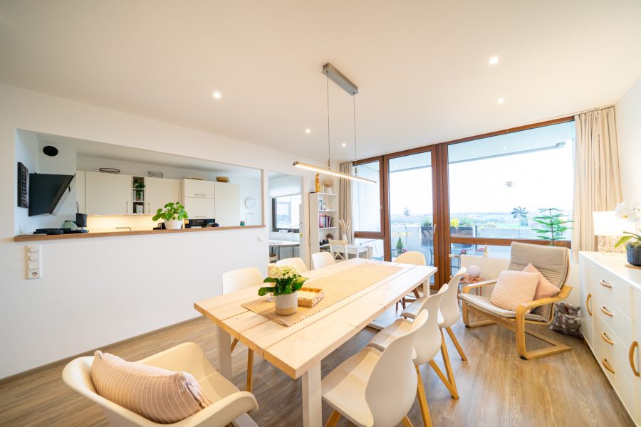 Der Essbereich ist geräumig und bietet viel Platz für einen großen Esstisch. Der durchdachte Grundriss sorgt für eine angenehme Raumaufteilung, die sowohl für ruhiges Wohnen als auch für gesellige Zusammenkünfte ideal ist. Die Wohnung ist nicht einsehbar, sie genießen hier ein hohes Maß an Privatsphäre. Die Loggia ist in Richtung Osten ausgerichtet. Die für diese Mikrolage bekannten, starken West-Winde betreffen Sie hier nicht. Vom Wind geschützt können Sie bei klarem Wetter den Fernblick genießen. Auf genug Sonneneinstrahlung müssen Sie hier nicht verzichten.