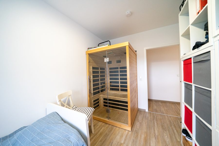 Durch die Glastür gelangen Sie zurück in die Diele. Dort finden Sie das moderne Gäste-WC mit kleinem Waschtisch und Platz für Waschmaschine und Trockner. Weiter den Flur entlang befinden sich auf der rechten Seite jeweils die beiden Schlafzimmer. Der als Kinderzimmer konzipierte, vordere Raum dient momentan als Arbeitszimmer und verfügt über eine kleine Infrarot-Sauna, die auf Wunsch in der Wohnung verbleiben kann.