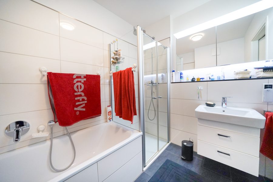 Zurück im Foyer befindet sich auf der rechten Seite das großzügige Tageslicht-Duschbad, das zugleich als WC für Ihre Gäste genutzt werden kann. Die komfortable und ebenerdige Dusche mit Regenduschkopf garantiert Ihnen einen perfekten Start in den Tag. Praktischerweise ist hier auch eine Trennwand installiert, die die Unterbringung Ihrer Waschmaschine ermöglicht. Ebenfalls auf der rechten Seite befindet sich ein weiteres Zimmer mit etwa 11 m², das als Schlafzimmer, Kinderzimmer oder Arbeitsraum genutzt werden kann.