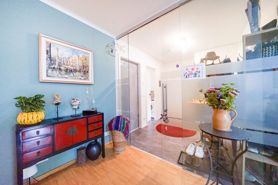 Das zentrale und einladende Foyer bietet genug Platz für eine Garderobe und schafft durch die Glasabtrennung in Richtung Wohnbereich ein sehr offenes Raumgefühl.