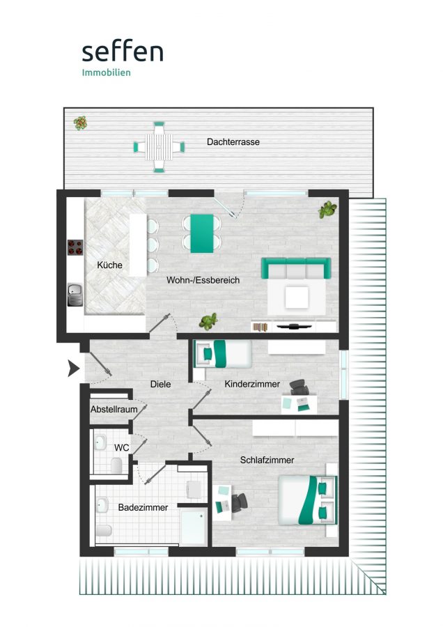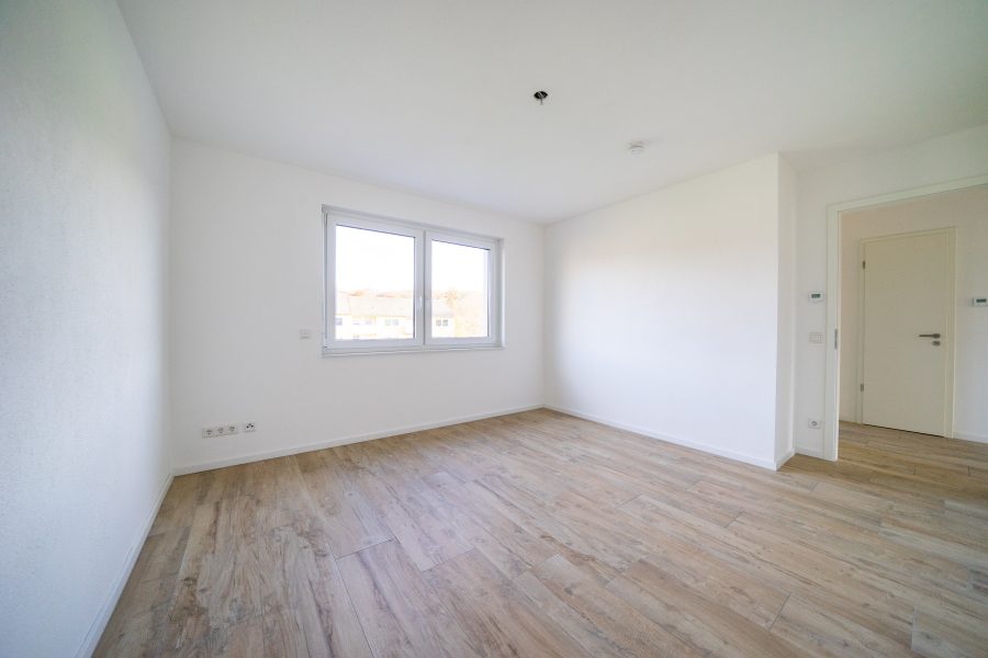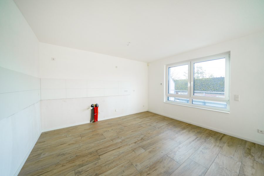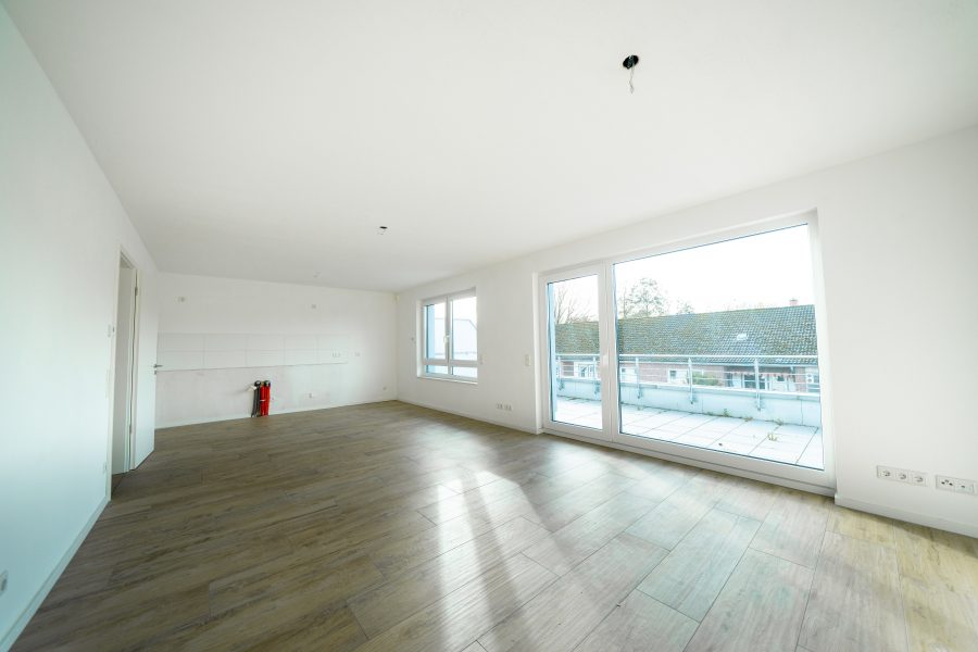 Das Herzstück bildet der großzügige Wohn- und Essbereich mit offener Küche. Durch den offenen Grundriss und die großen Fenster entsteht ein helles, luftiges Raumgefühl – ideal für modernes Wohnen und kommunikatives Beisammensein. Von hier aus gelangen Sie auf die rund 24 m² große Dachterrasse mit Süd-West-Ausrichtung. Hier genießen Sie Sonne bis in die Abendstunden. Die hochwertigen Fliesen in Holzoptik verleihen den Räumen eine warme und elegante Atmosphäre.
